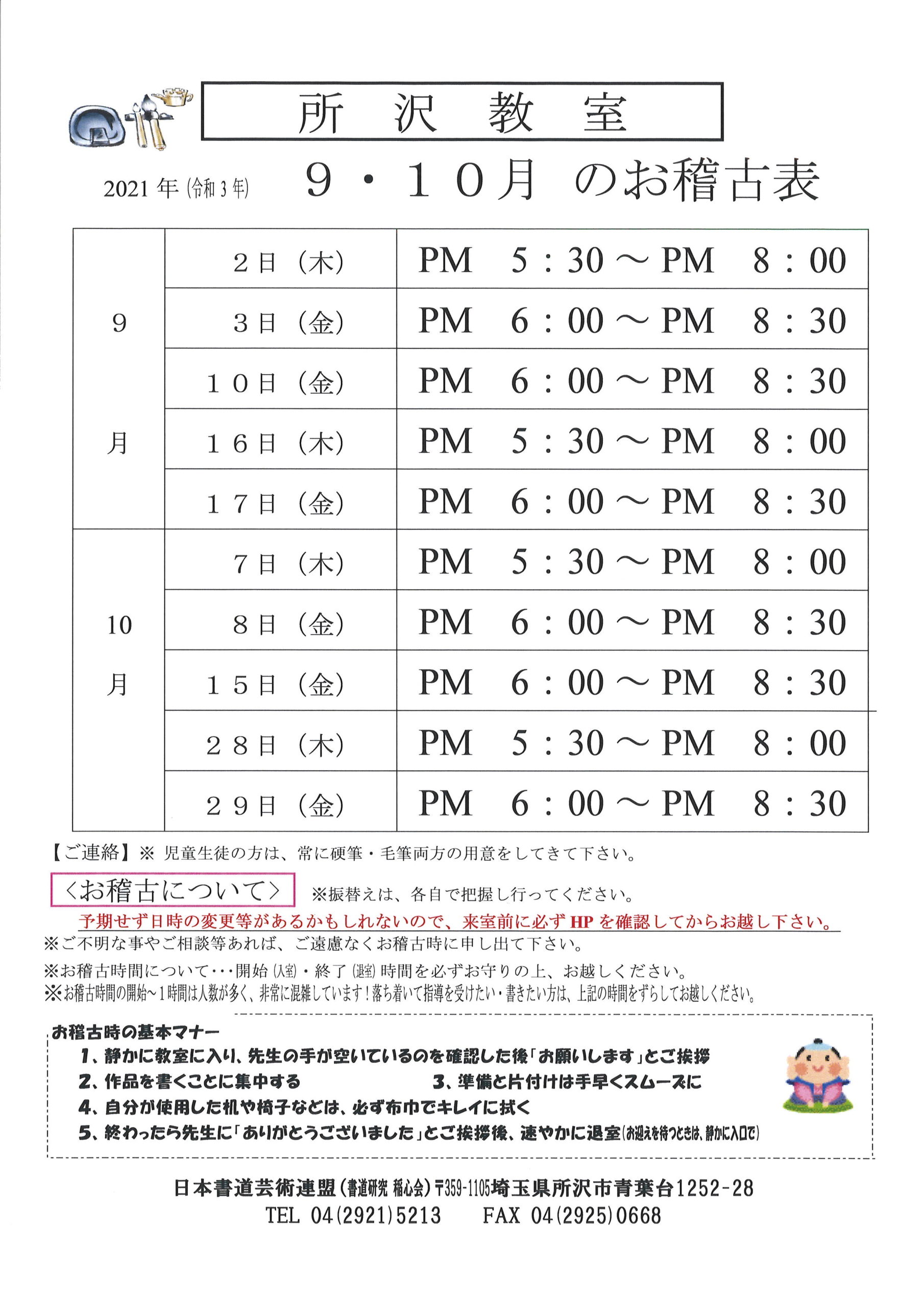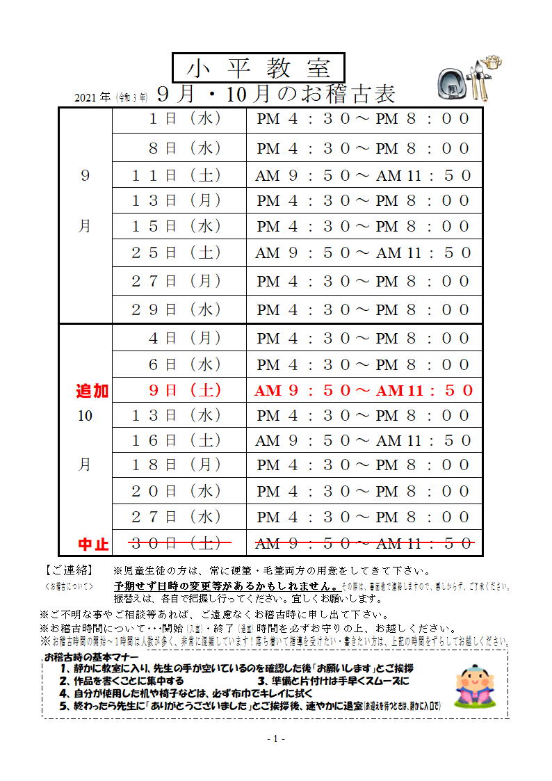 すでに教室に掲示してお知らせの通り、10月30日㈯の稽古を中止し、かわりに10月9日㈯を追加しました。