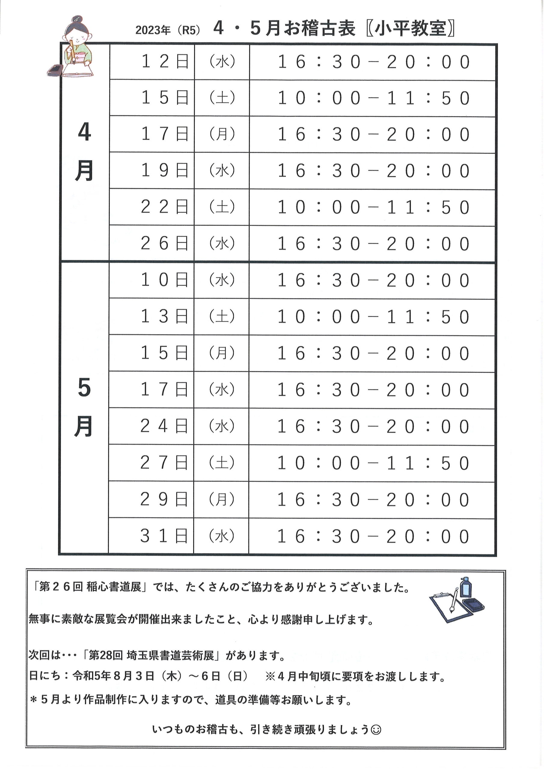 4月/5月お稽古表(所沢・小平)