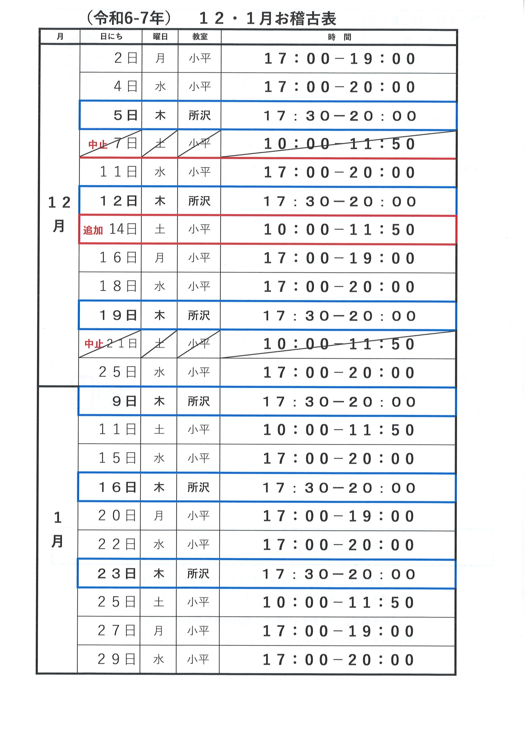 12月のお稽古表の土曜日に訂正があります。ご確認下さい。